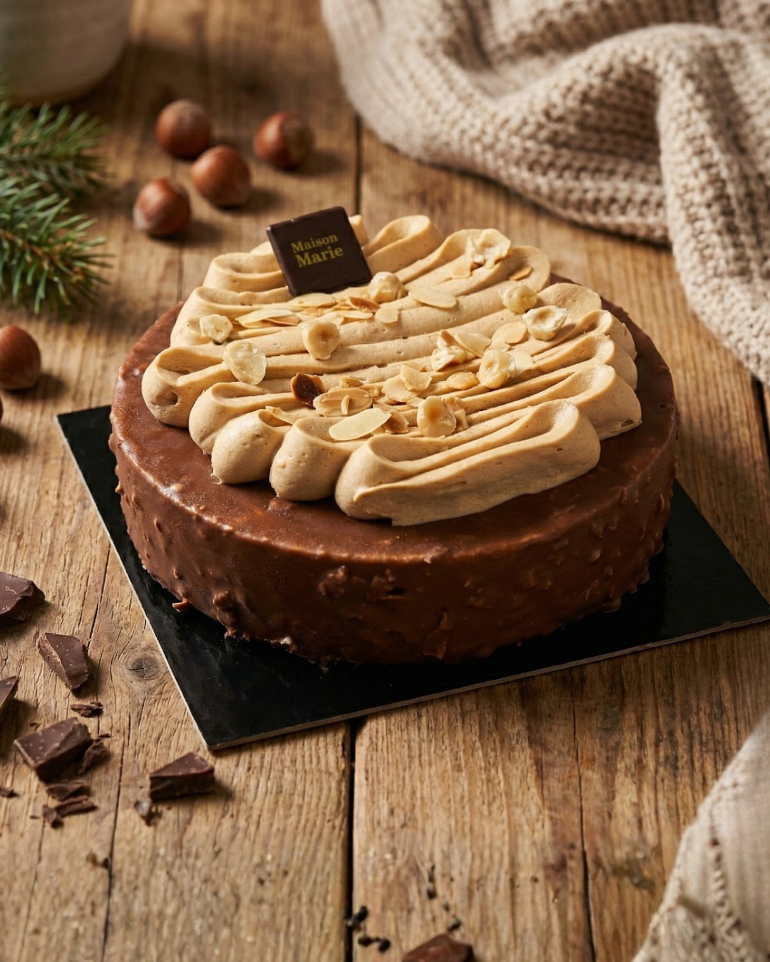 Mousse praliné noisettes, mousse vanille, cœur coulant praliné, croquant noisettes